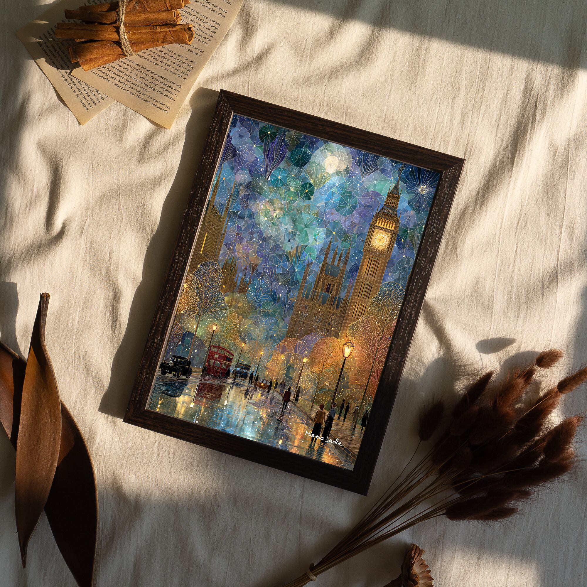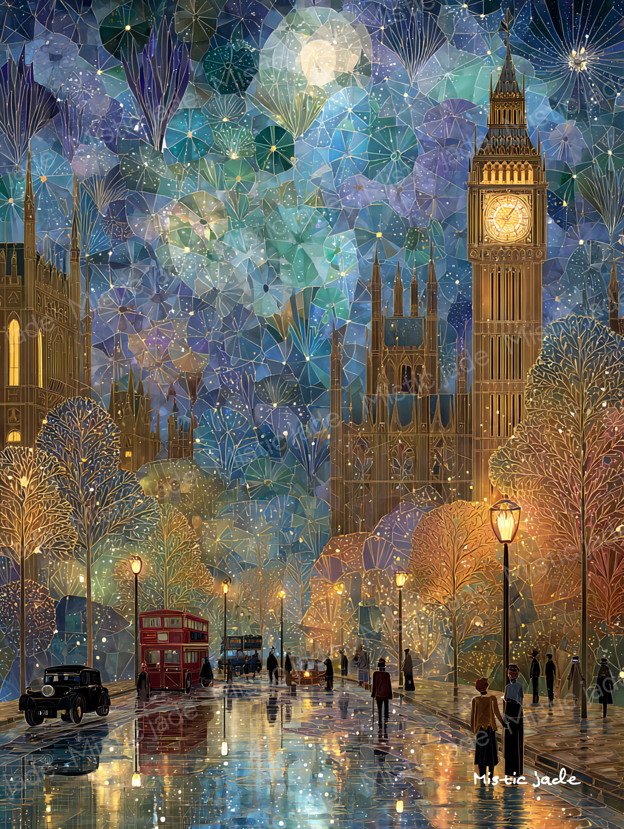 夜のロンドン、雨上がりの石畳に星々が映り込み、まるで天と地がひとつに繋がる夜。