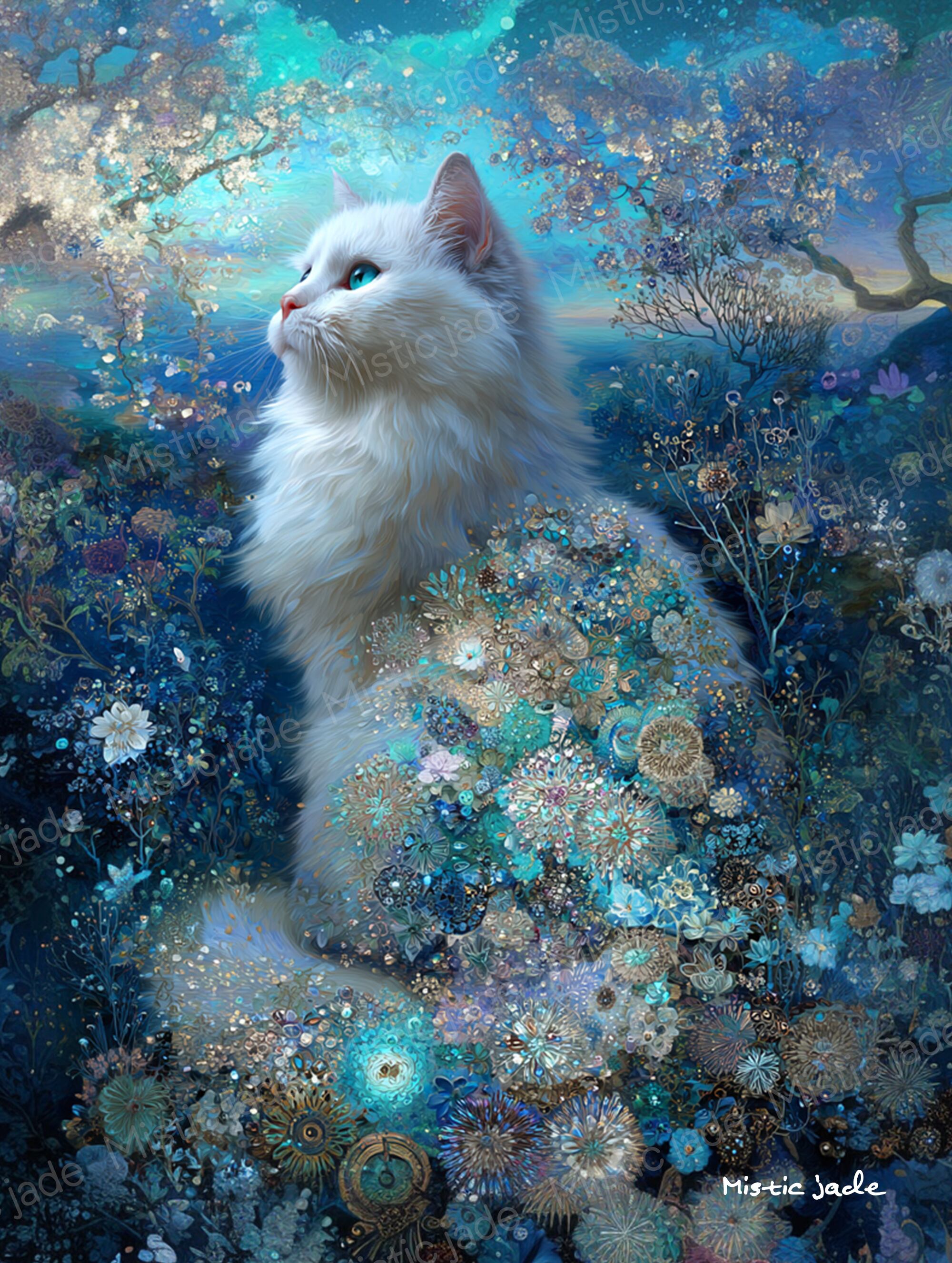 月明かりの降る夜、静寂の森にそっと佇む白猫。